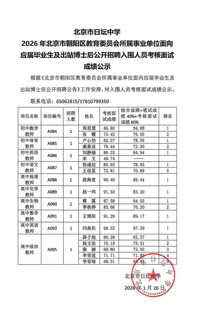 北京市日坛中学2026年北京市朝阳区教育委员会所属事业单位面向应届毕业生及出站博士后公开招聘入围人员考核面试成绩公示