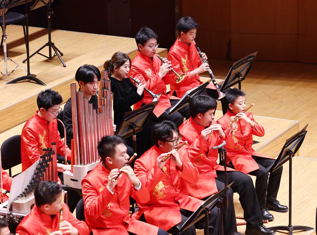 伴随着欢快的序曲旋律,新春音乐会正式开场。音乐会分为上下两个半场,上半场有“致敬”“青春”“最美中国”三个篇章,由管乐团演奏,下半场由民乐团演奏。