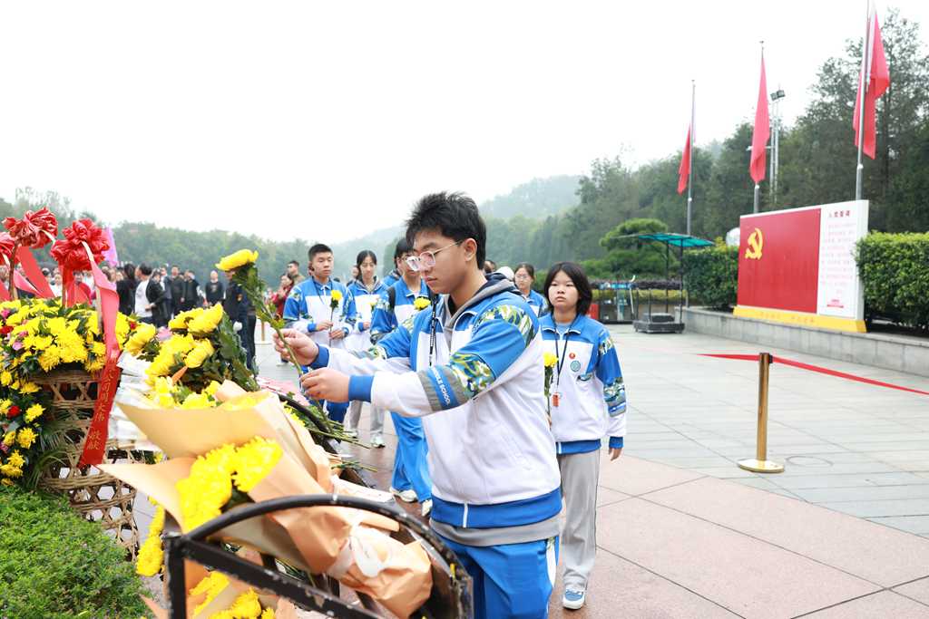 在韶山毛泽东铜像广场,师生整齐列队,手持菊花依次敬献,表达对一代伟人的崇高敬意与深切缅怀。一名同学在日记中记录下讲解员讲述的故事——毛主席铜像运回途中,车辆在井冈山莫名停留,“仿佛是他想再看看曾经奋斗过的热土”。真实的故事让仪式更具感染力,也让信仰的种子在同学们心中深深扎根。仪式最后,“请党放心,强国有我”的誓言响彻广场,传递出日坛学子接续奋斗的坚定决心。