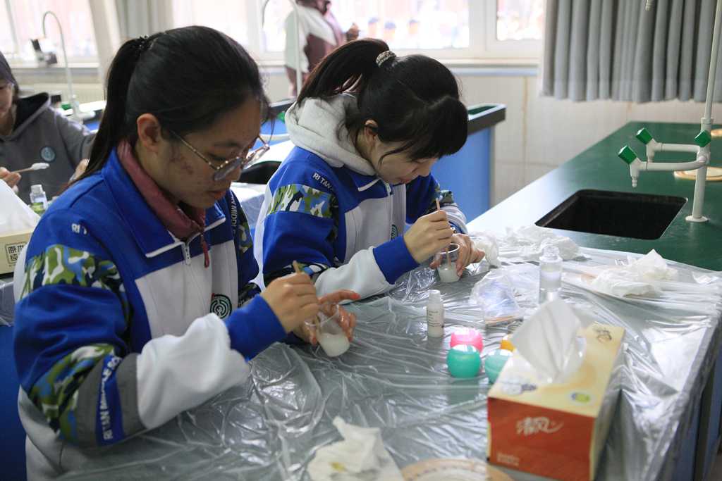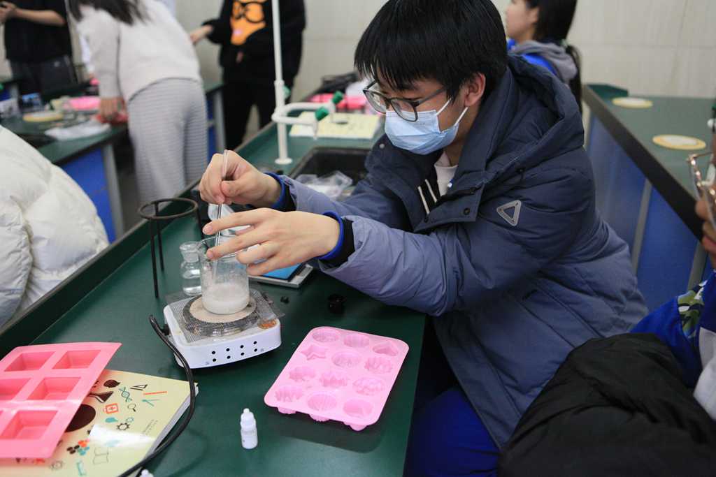 在"制作香皂"与"制作护手霜"的化学实践区,同学们化身小小化学家,亲手调配原料、观察反应过程。从皂化反应到乳化原理,抽象的化学公式在杯中舞动,化作馨香实用的日常用品。