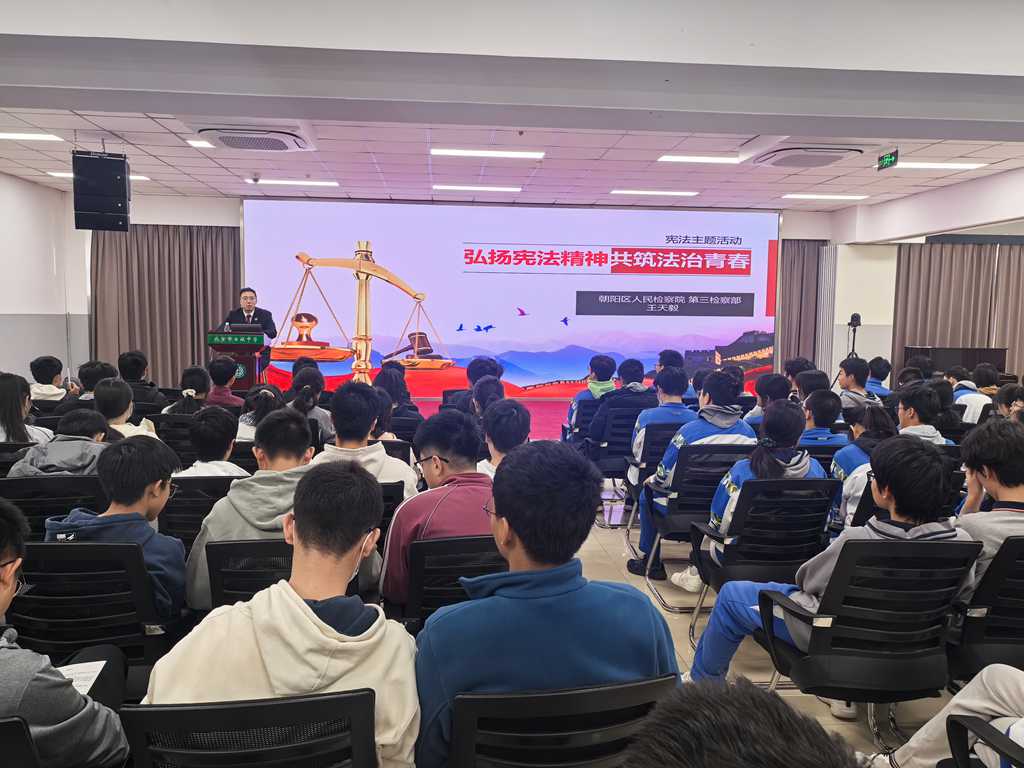 12月2日,学校特邀朝阳区人民检察院第三检察部王天毅检察官到校,为学生们带来“弘扬宪法精神 共筑法治青春”主题讲座。王天毅检察官结合宪法结构与实际案例,围绕防范校园欺凌、识别“套路贷”、警惕网络诈骗等话题,生动讲解了宪法与公民的关系,引导学生树立法治观念,增强自我保护能力。