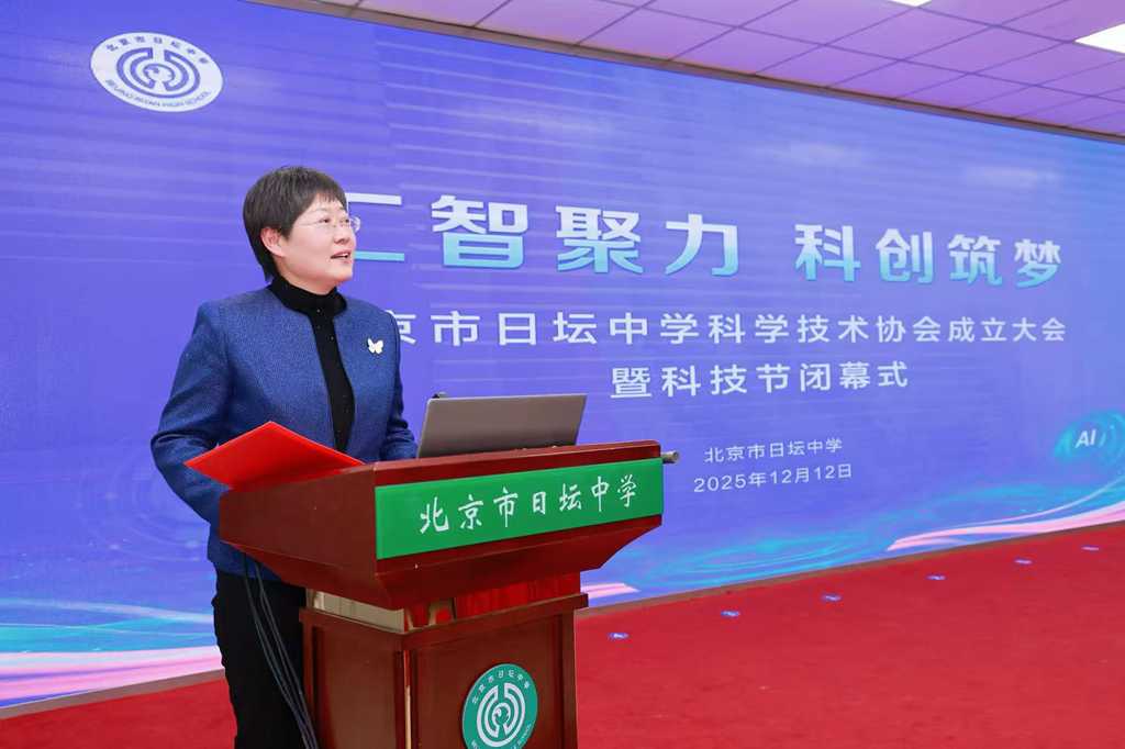 发表日期:2025-12-15 来源:作者: 12月12日,北京市日坛中学举行学校科学技术协会成立大会暨科技节闭幕式。此次活动以“汇智聚力,科创筑梦”为主题,旨在全面落实教育部等七部门《关于加强中小学科技教育的意见》,将科技教育向纵深推进,构建“多方协同、科教融合”育人新格局。领导嘉宾、校外专家及师生代表齐聚一堂,活动由日坛中学副校长郭素双主持。