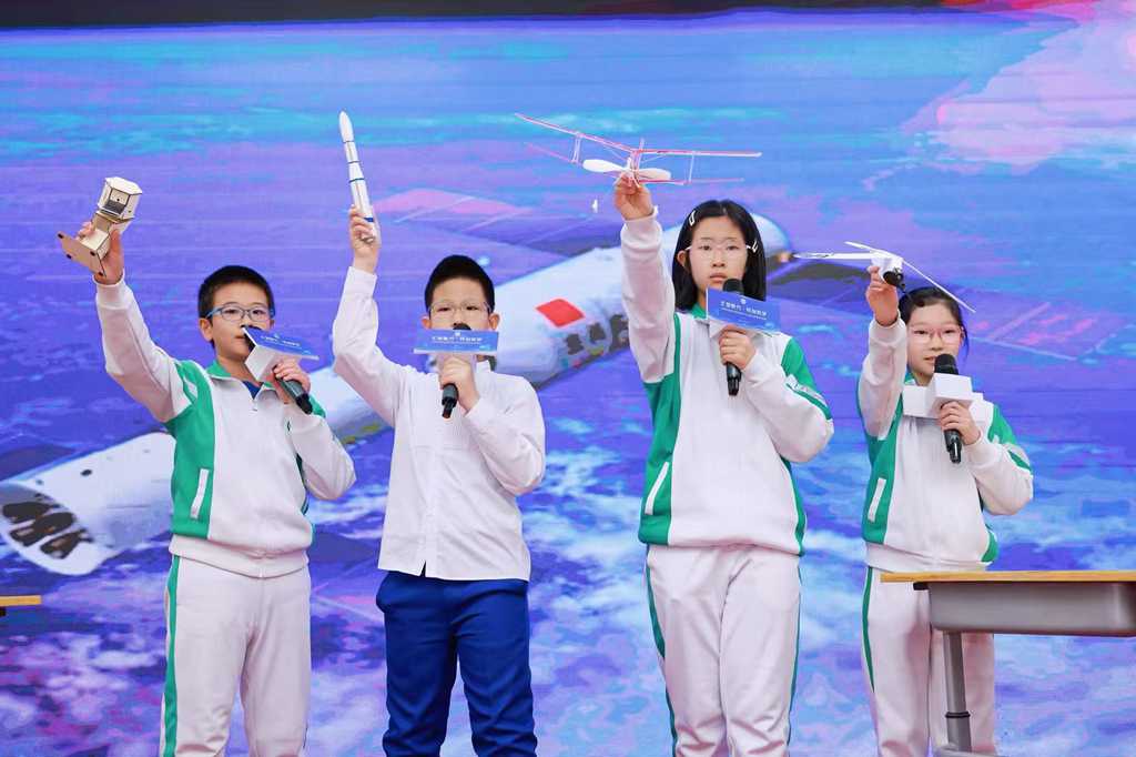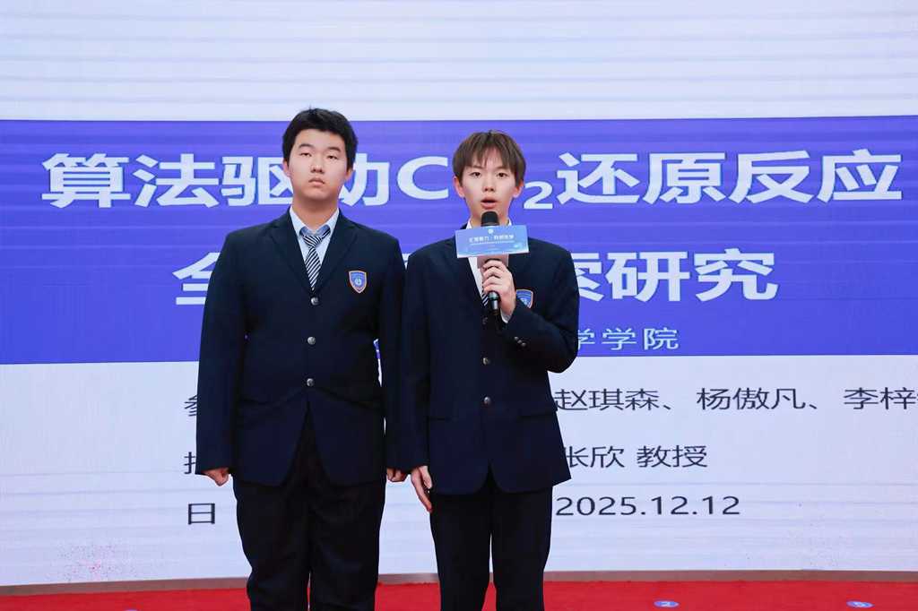 小学、初中和高中的学生代表分别展示了他们在今年科技节中的科创成果:小学同学们科普剧《太空能量卫士》充满童趣与想象力,初中学生们的“一小助一老”发明展示体现了科技与人文融合,而高中生的“算法驱动二氧化碳还原反应全路径搜索”研究项目则展现了学生们的科学探索能力。