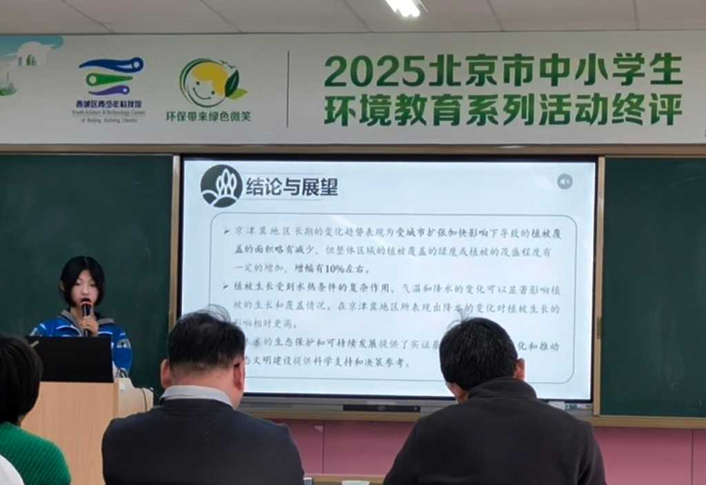 12月14日,初三2班的徐琬婷同学带着自己的环保项目《2011-2020年京津冀地区植被NDVI时空变化及其对气温及降水的响应探究》走进北京市西城区青少年科学技术馆,参与了2025北京市中小学生环境教育系列活动终评展示。将自己的研究成果分享给更多师生,为建设美丽中国贡献自己的一份力量。