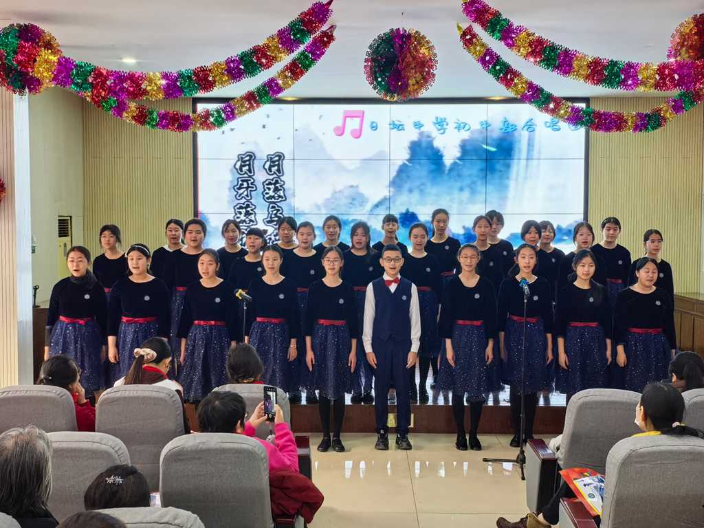 初中部合唱团带来《声声慢》《心同此愿》两首合唱作品。《声声慢》的古典意蕴与婉转唱腔,让大家沉浸在传统诗词的韵律之美中;《心同此愿》则以昂扬的旋律传递出对学校、对未来的美好期许,整齐的和声展现出合唱团扎实的功底。