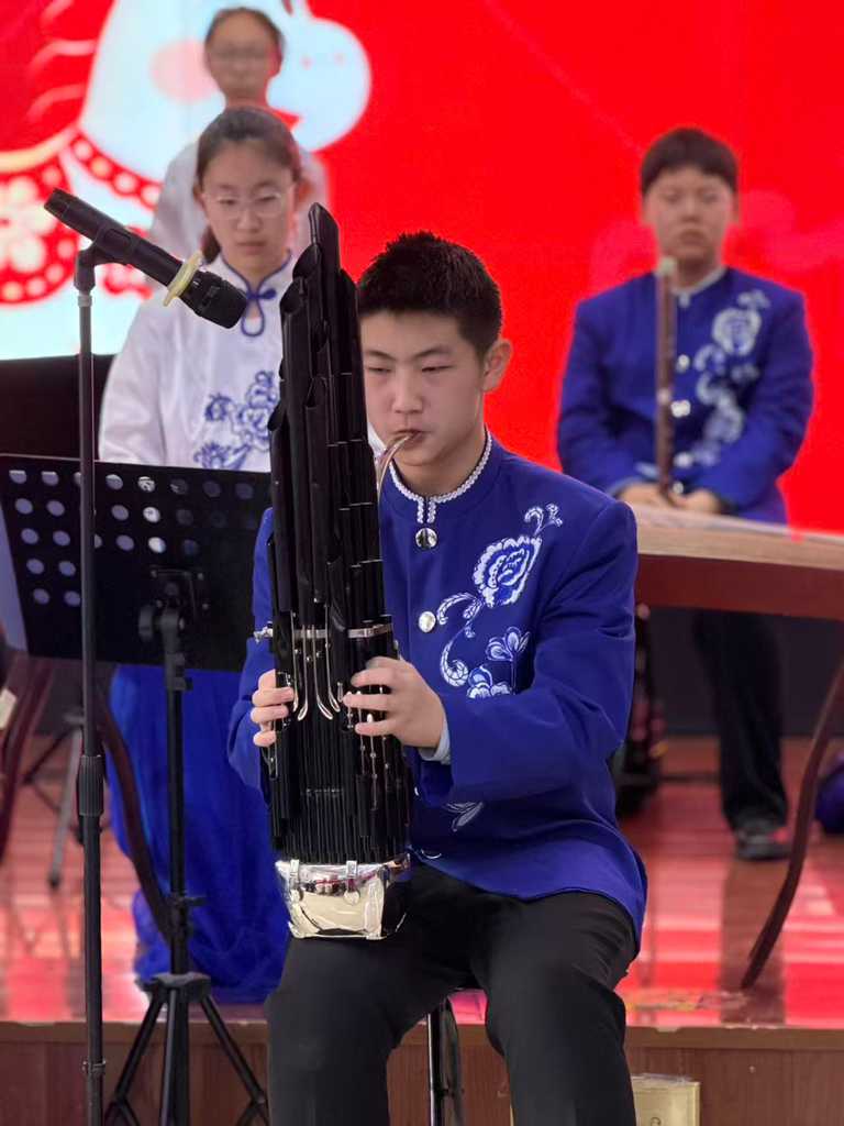 初一5班卢奕布同学带来的笙独奏《西班牙斗牛士舞曲》,激昂的旋律从笙管中流淌而出,节奏明快、气势磅礴,瞬间点燃了现场的热烈氛围。